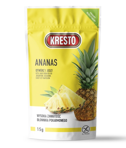 ANANAS W KAWAŁKACH 100% OWOCU liofilizowany to produkt bezglutenowy, wegański, charakteryzujący się wysoką zawartością błonnika pokarmowego. Do wyprodukowania 100g ananasa liofilizowanego zużyto 0,7 kg ananasa świeżego.